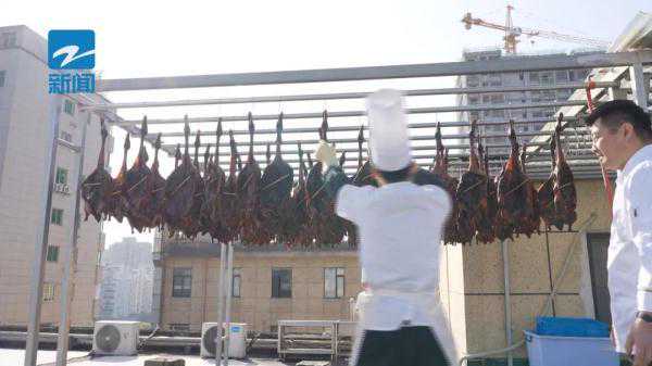 在杭州金地大厦楼顶,有大厨正把昨天收拢的酱鸭拿出来,一只只晾晒在架子上,在阳光照射下,酱鸭的表皮微微渗出一点油脂。北风一吹,一丝丝香味,不知不觉就钻进了人的鼻子。这种大张旗鼓晾晒酱鸭的场景,和清代的《杭俗遗风》里所写的简直如出一辙:“酱鸭一味,以杭城绍酒店所制者为佳。每岁八九月间,各酒肆皆自制酱鸭,多者数百,少者亦百余。”