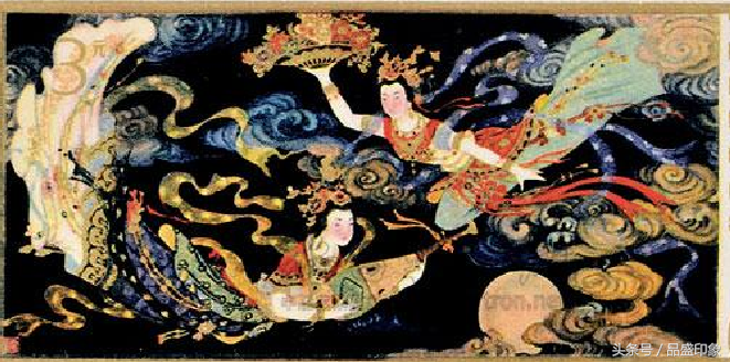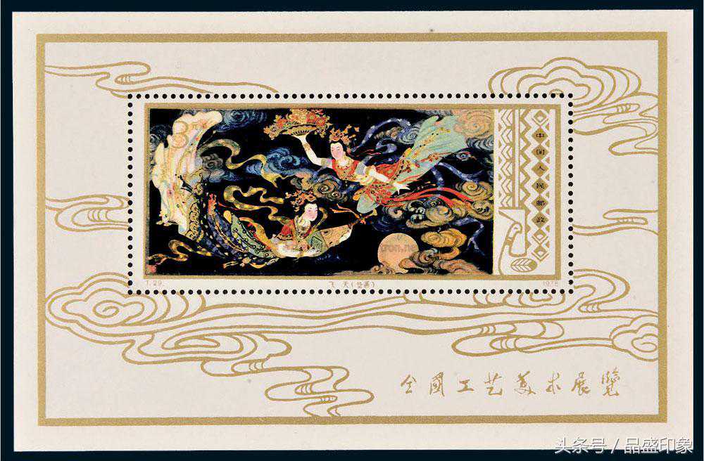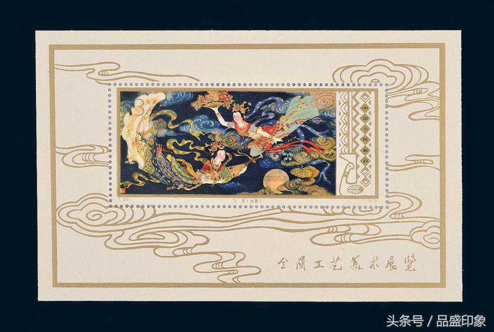 “工艺美术”小型张的设计非常的精美,深蓝色的北京于飞天鲜艳的服饰相比,更能体现出天空的深邃悠远,流动着的富余变化的线条,将飞天的姿态与衣诀的飞扬表现得淋漓尽致,纸边空白处洁白悠悠的云朵使其深化气息愈加的浓重;在构图上既有强烈的动感,又显得大气稳重。
