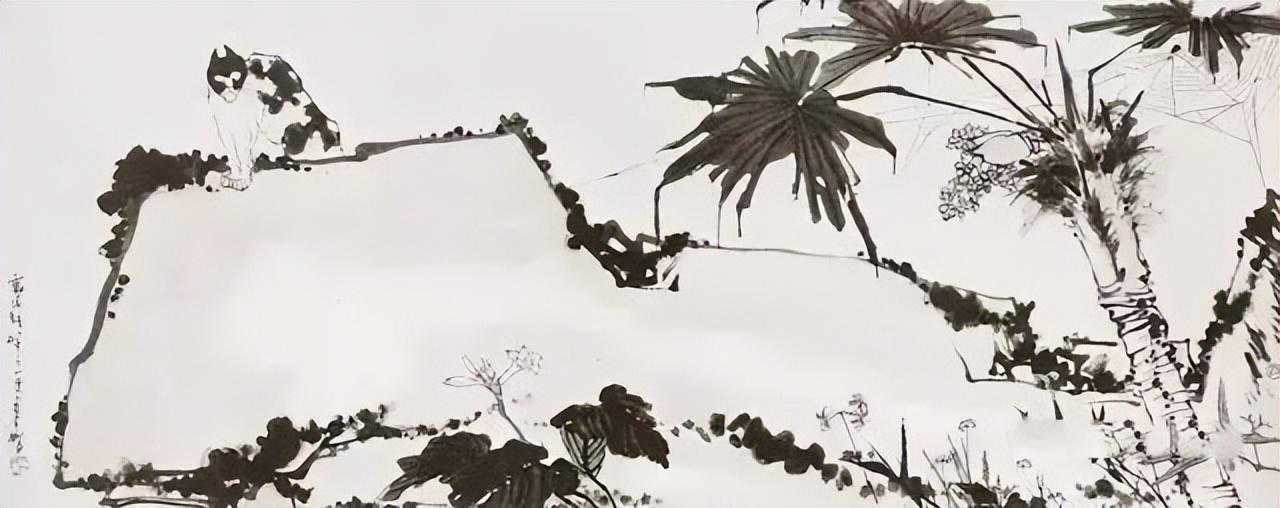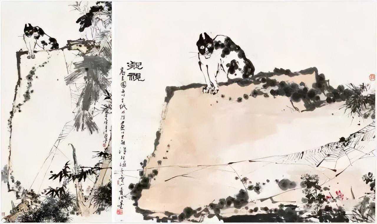 再比如,画完一张觉得不过瘾,还想画出新构图和笔墨的。最典型的是《凝视图轴》,同样是一只猫立于岩石之上,却有横构图和竖构图两种不同表达,都很精道。