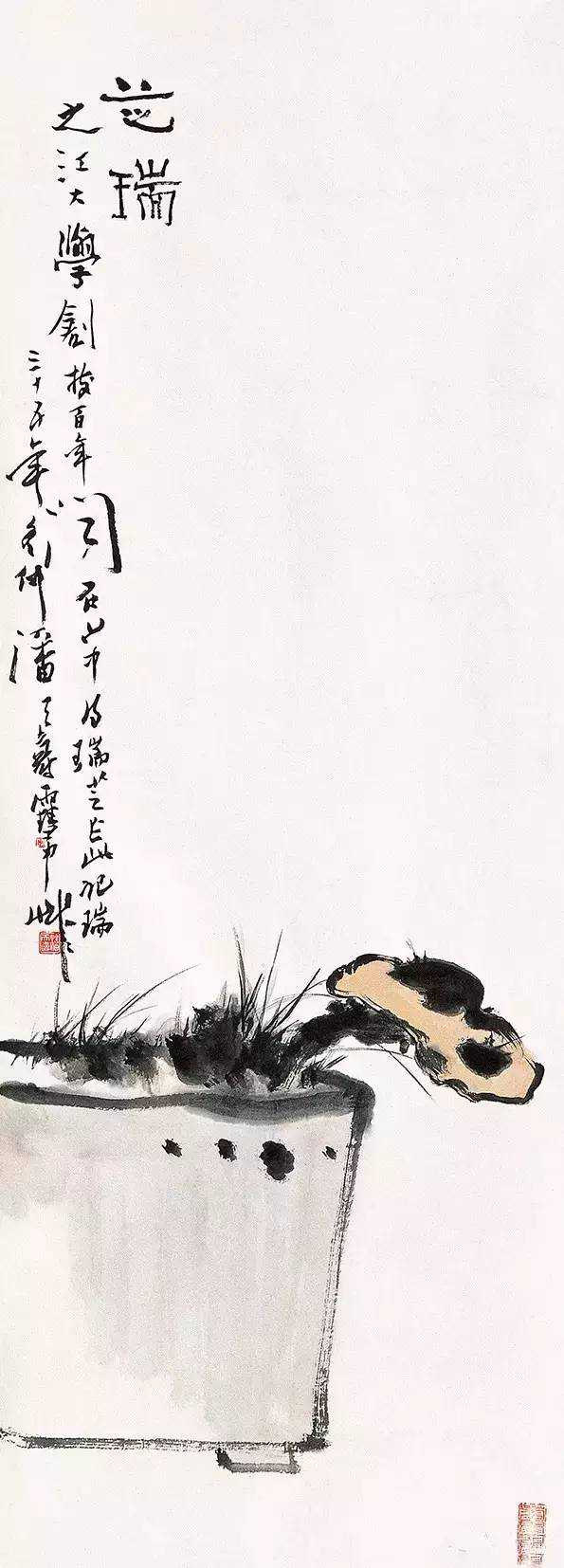 在20世纪中国画大家中,潘天寿的“变体画”数量不少,根据他作品的特点,非常适合诠释中国画的构图问题。潘天寿特别强调构图,讲究“造险破险”,因此画面极具设计感、形式感,也经得起推敲。来通俗地打个比方,你一定知道他的代表性画面,石块尤其巨大,和一般的传统山水画很不一样。