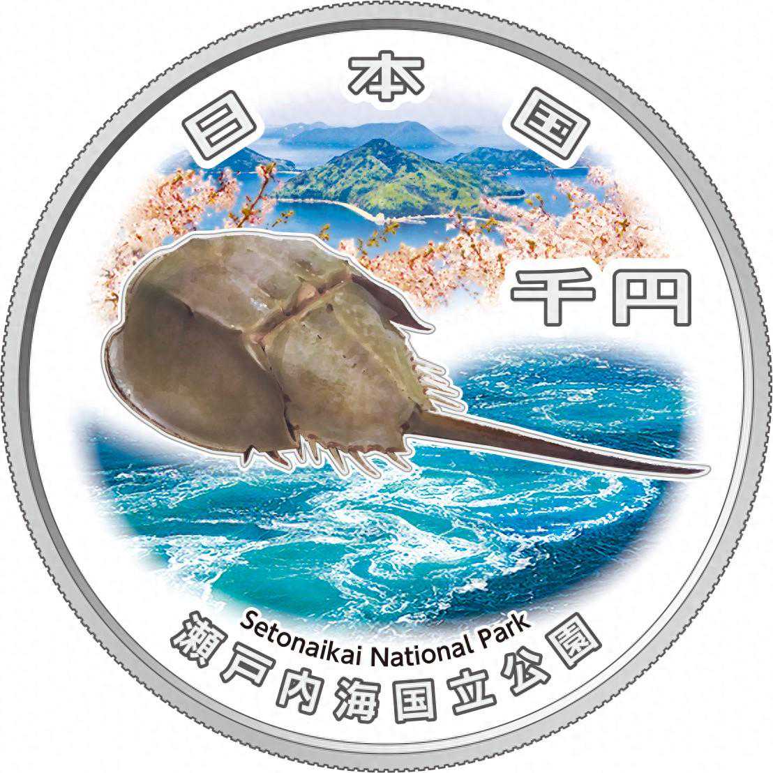 背面设计:濑户内海国家公园纪念币的背面为从诗留都山俯瞰群岛海景的景象,下面是鸣门海峡的漩涡与日本马蹄蟹。