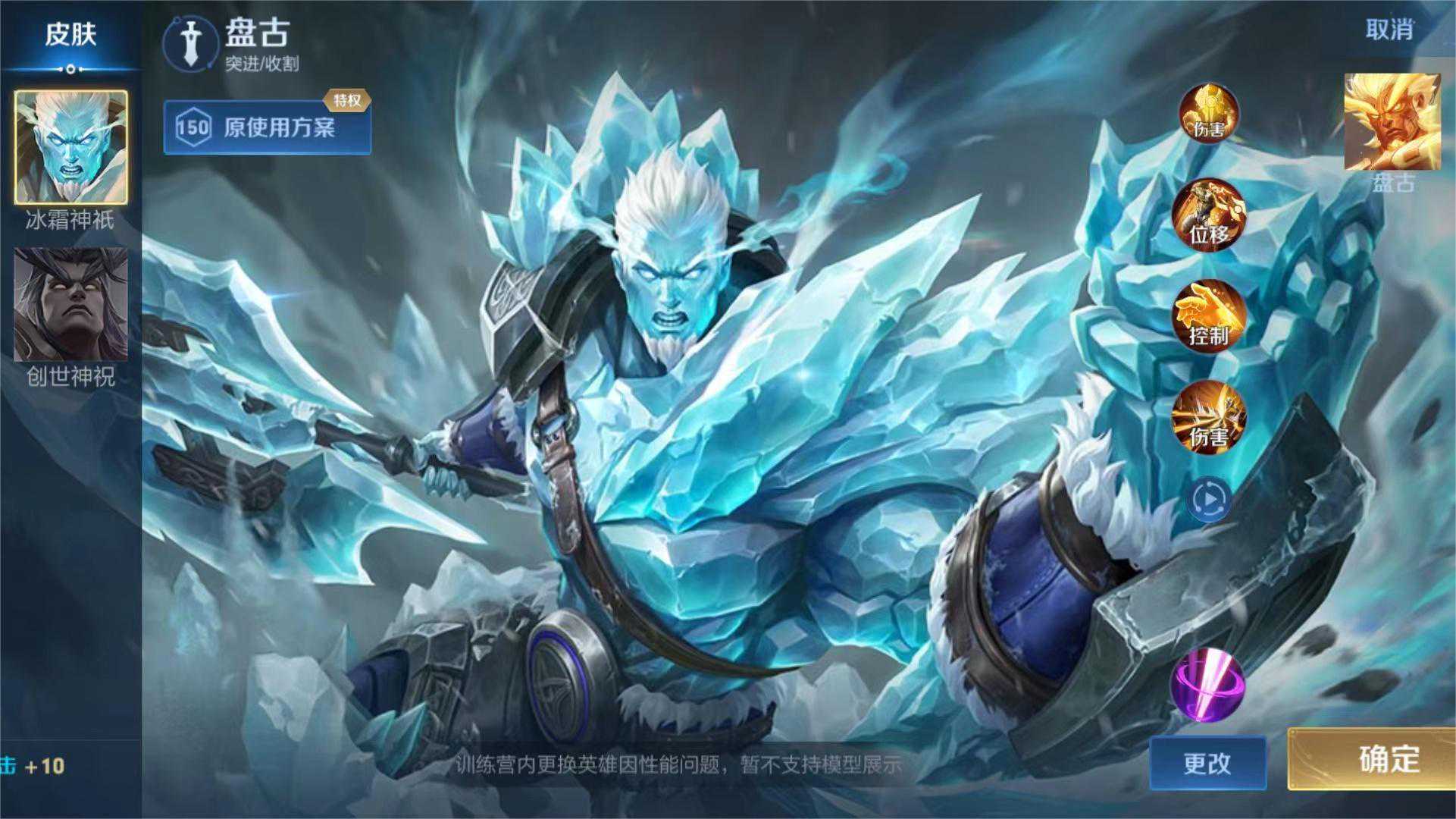 盘古——冰霜神祇由于要冲级V10,累计充值已经达到门槛了,领到了盘古的冰霜神祇皮肤。