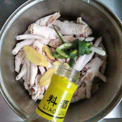 3、把处理好的鸡脚放入小汤锅中,加入几片姜,小葱打成结同时放入