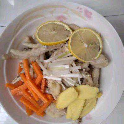 7、在煮熟的鸡脚上面,再次放入几片姜,两片柠檬,胡萝卜切成条状放入,芹菜去根去叶,洗净切成条状,同时放入大碗中。