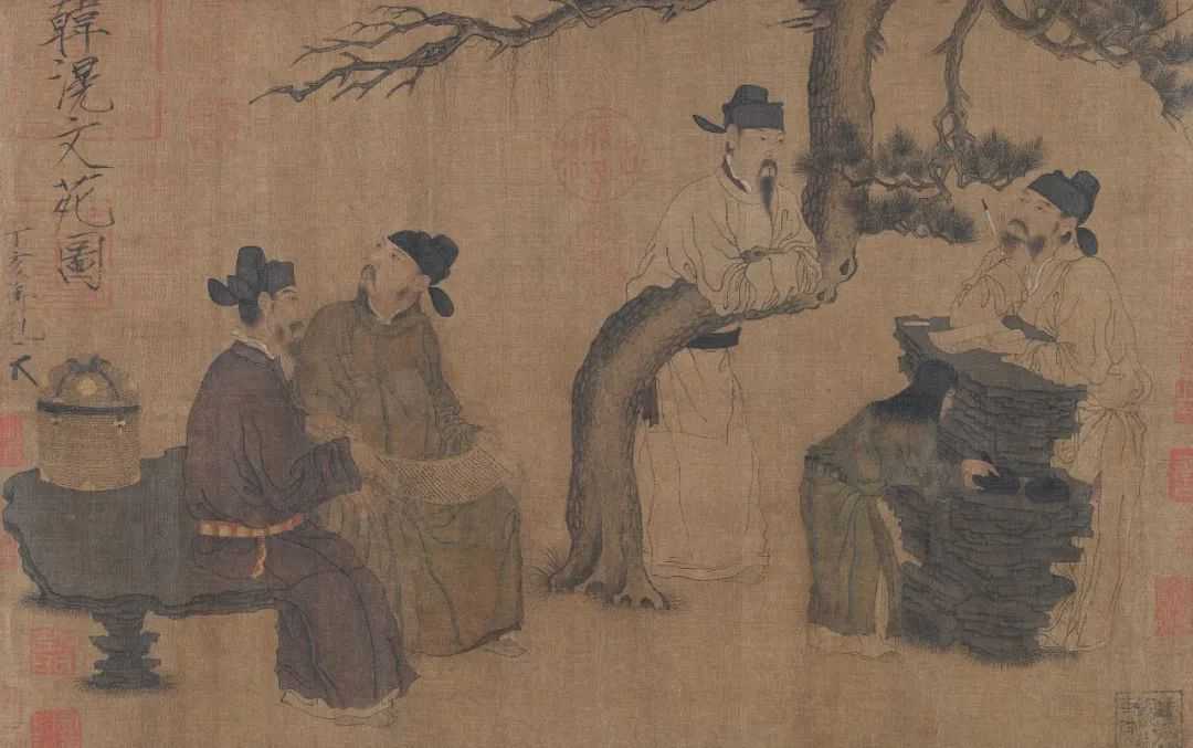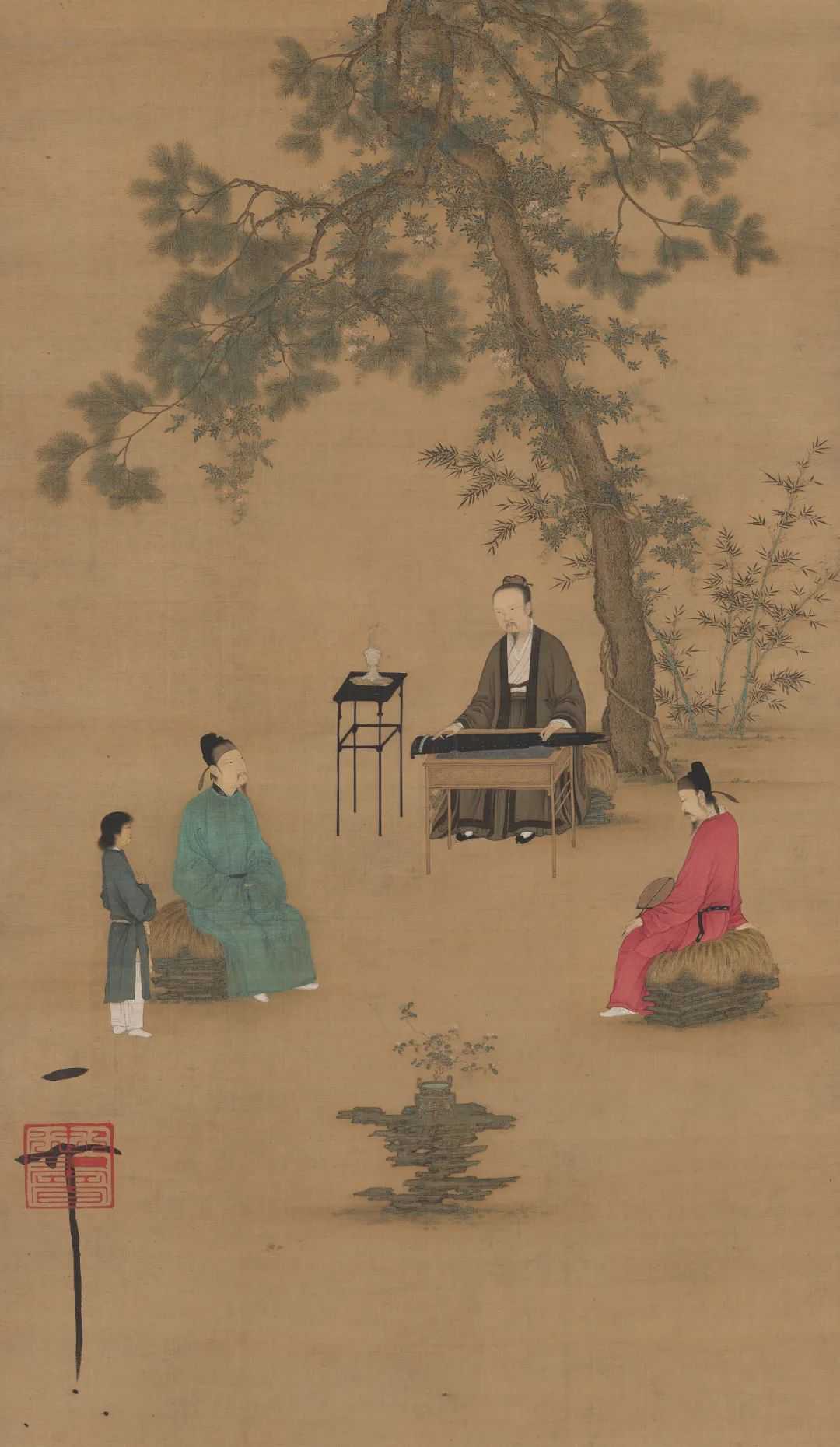 在旧传为徽宗作的《听琴图》轴中,我们可见宋徽宗调琴赏乐的情景。