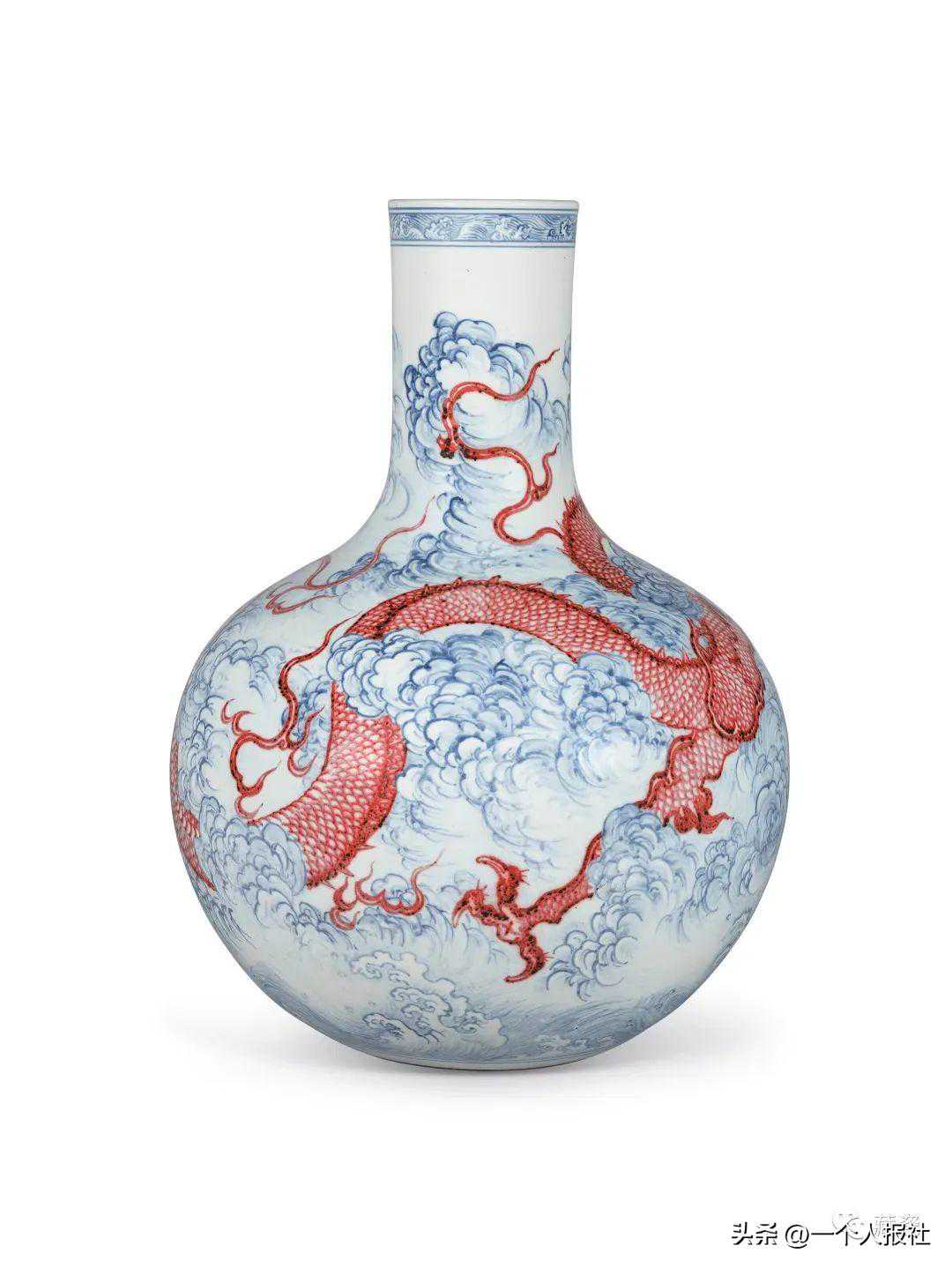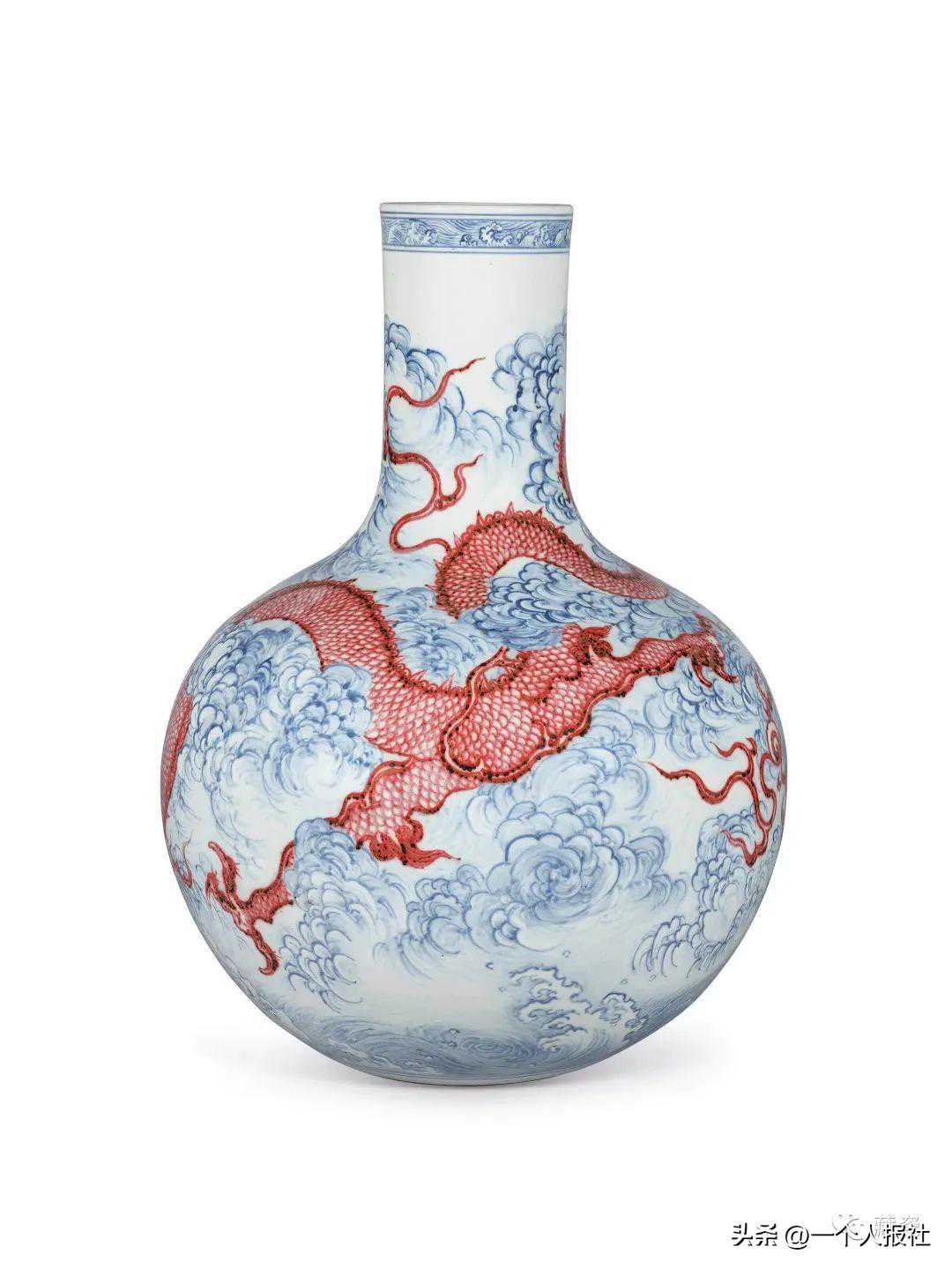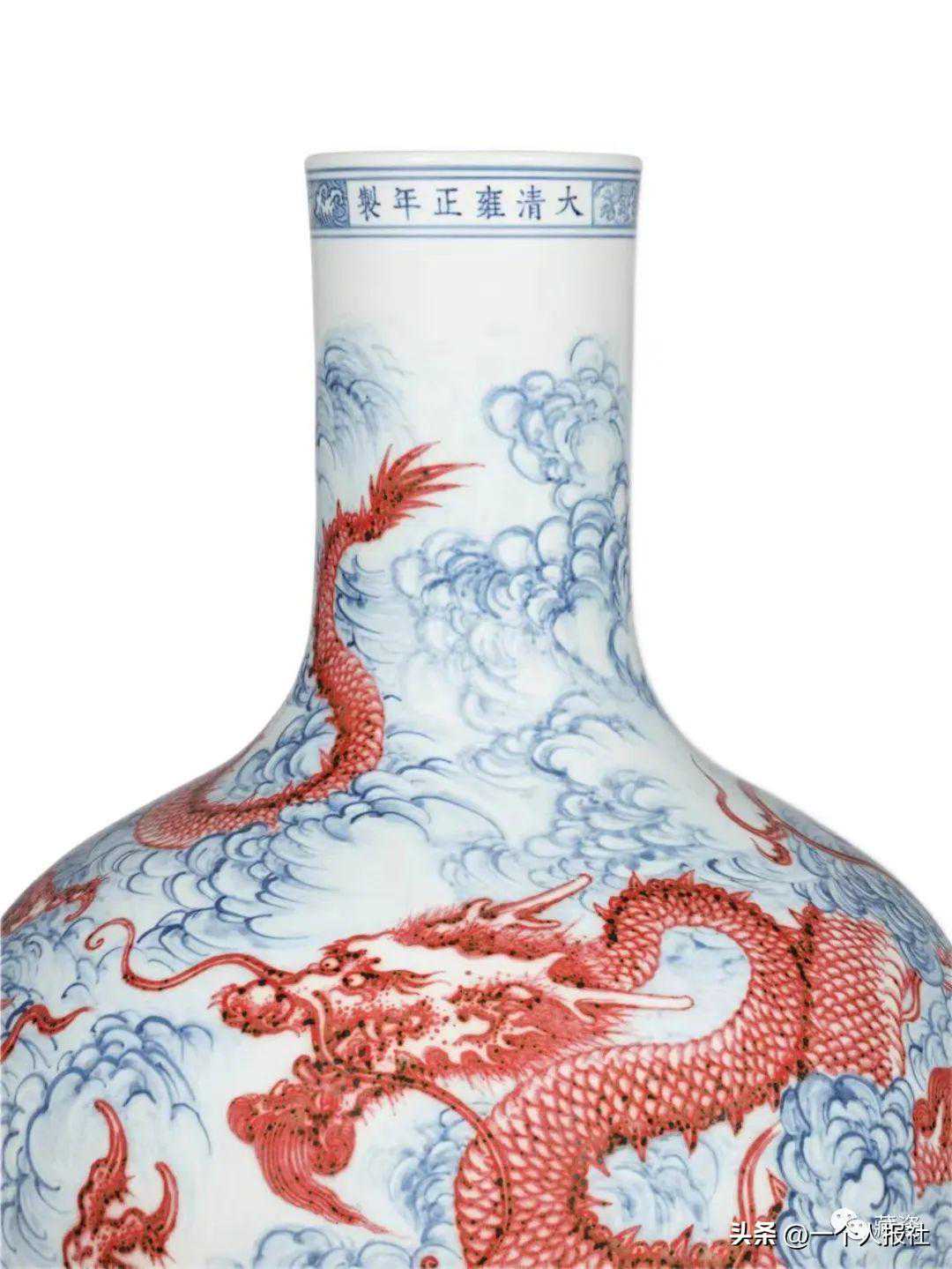 Lot2840清雍正青花釉里红云海腾龙纹天球瓶