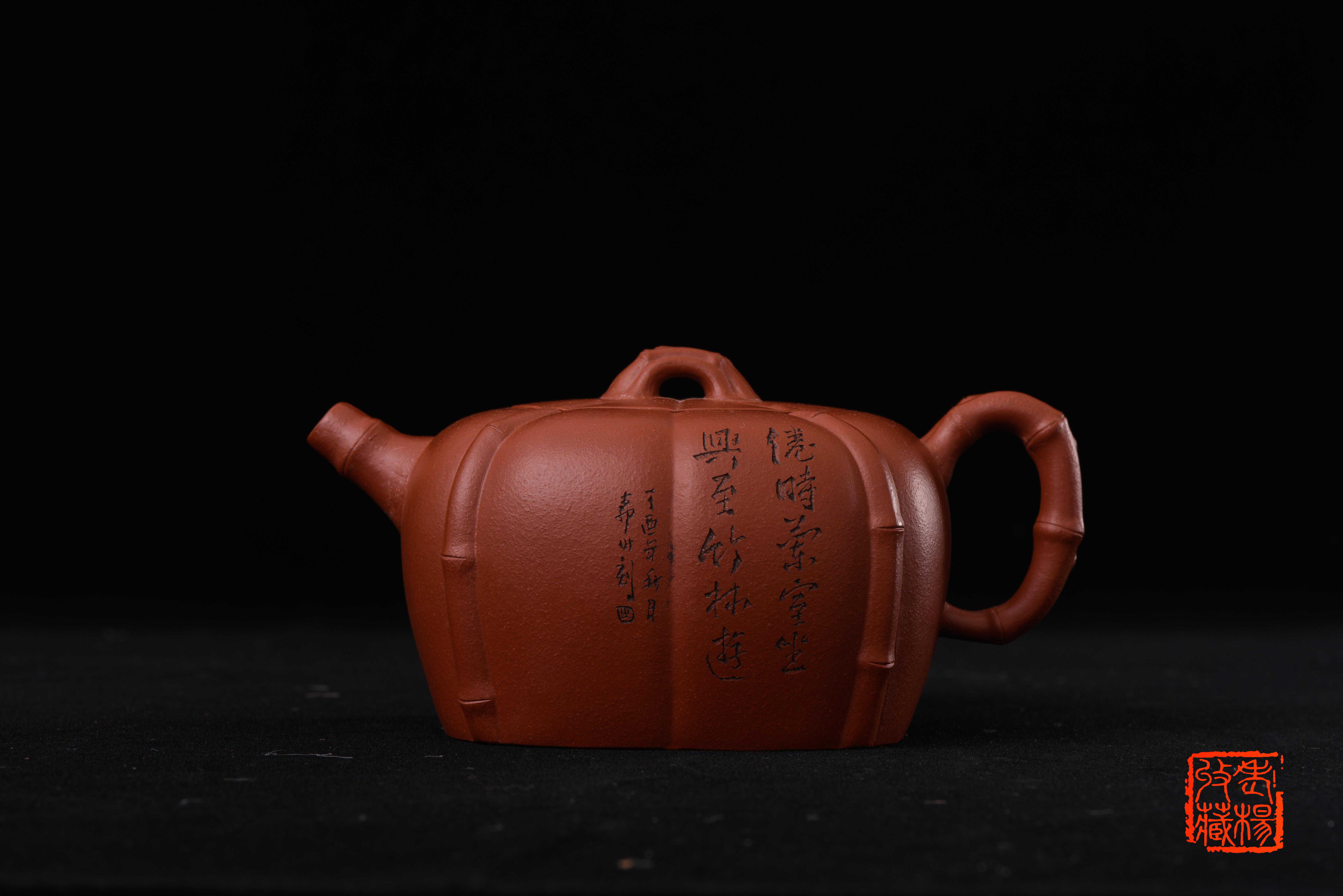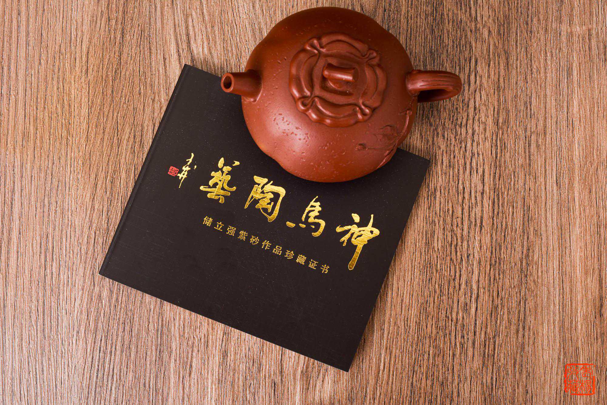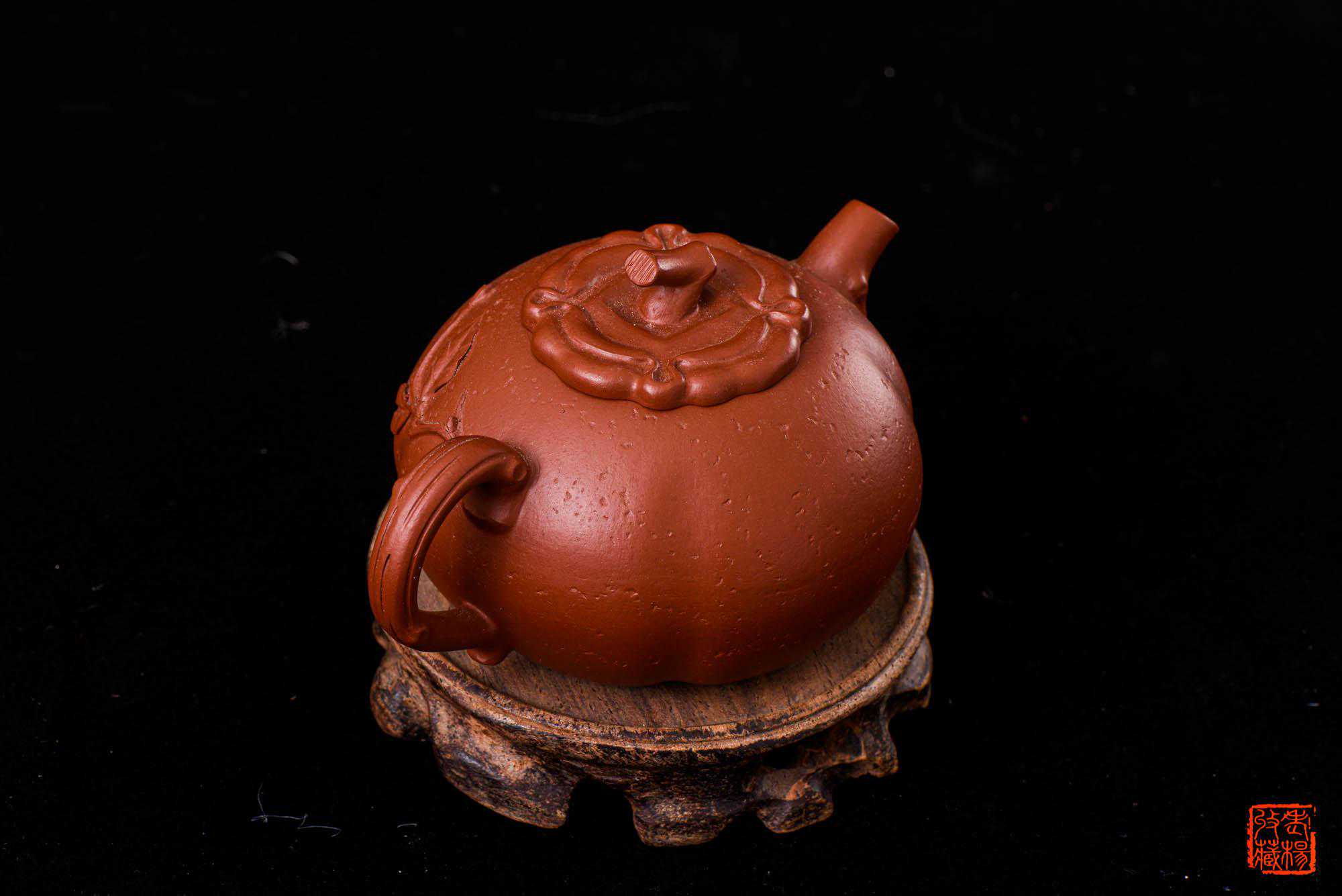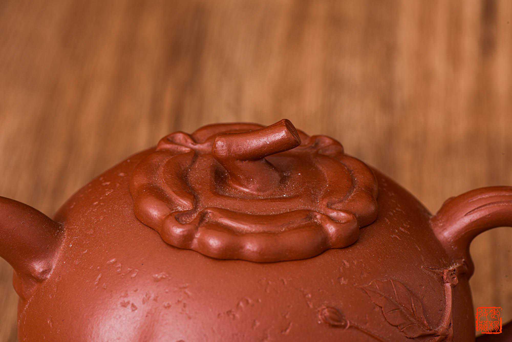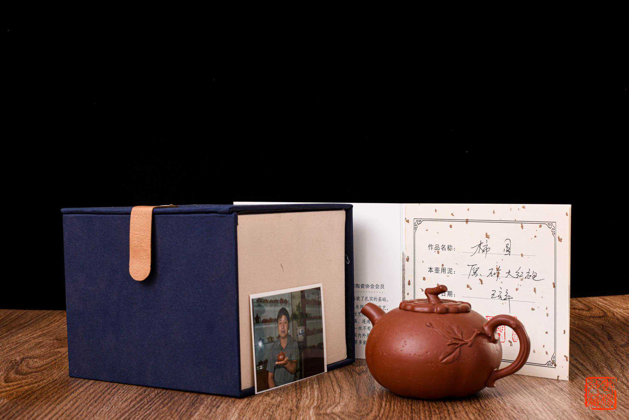 其制作的柿圆壶形态端庄,线条流畅,造型简劲而不简单。以原矿大红袍泥为原料,泥色红润艳丽,质地细腻,颜色浑厚。整器高11.7厘米,宽7厘米,口径为5厘米,有着200毫升的容量,足以满足品饮需求。