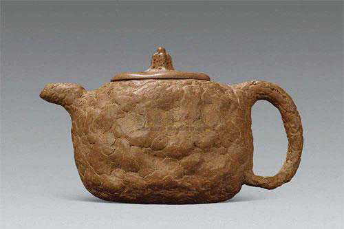 几何型的花货是将壶钮、盖、流和把部件制成具象化的自然物件依附于几何形的紫砂壶上,或是在器物显眼部分施以简洁的堆雕装饰,这类花器在外观整体上仍保持简明的几何形状。