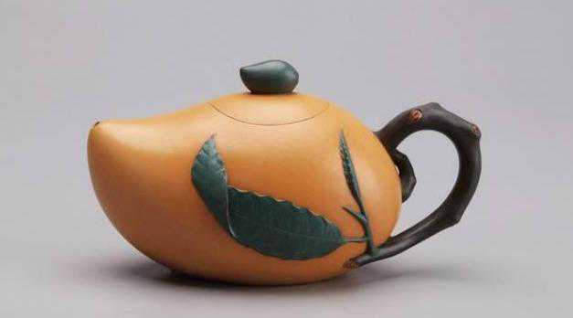 到了近代,民国紫砂壶七艺人中蒋蓉先生可谓是当代紫砂花器艺术的开山人物、花器艺术的一代宗师,在其七十余年的壶艺生涯中,一直致力于创新,其作品形神具备、美与趣兼得,开拓了紫砂仿真花器的新局面。其制作的芒果壶,以具象的仿生手法,直接模仿了植物的纹理和形态,壶身以黄色的芒果为形,取用果树枝干的造型为壶柄,芒果末端微微翘起以小口作为壶嘴,浓绿色的果叶跟随树枝紧贴于壶身侧面做纹饰,翠绿的小芒果为壶钮,整体形象逼真。